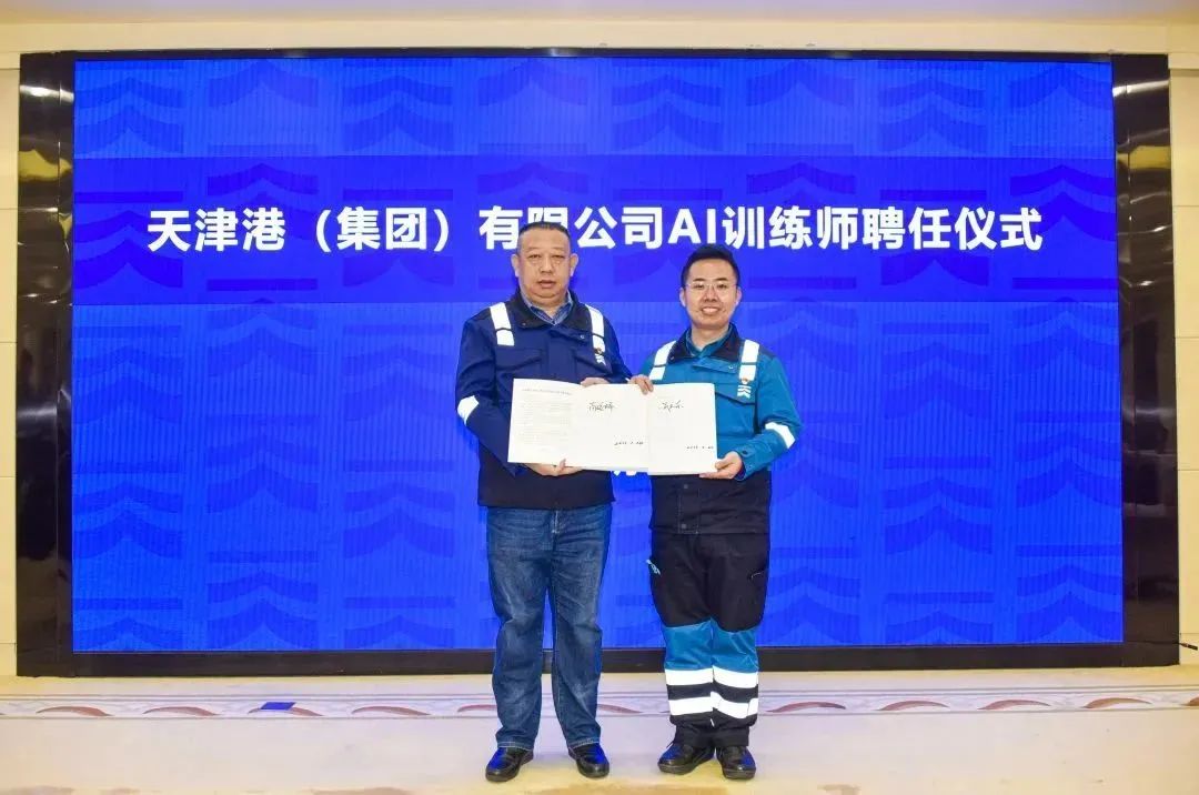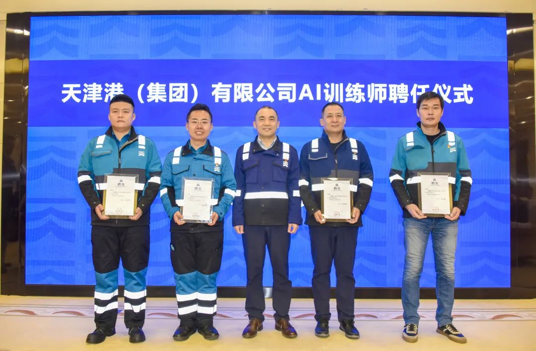 为深入推进“以质为先、效率至上、创新引领”的世界一流智慧港口建设,深耕人才沃土,厚植创新根基,2月24日上午,天津港集团聘任全国港口行业首批AI训练师。天津港集团副总裁杨杰敏为一公司拖头队副队长成卫东,煤码头公司孔祥瑞操作队队长张瑞元,太平洋国际公司操作队副队长包振园、欧亚国际公司机械队场桥司机刘玉鹏颁发聘书。